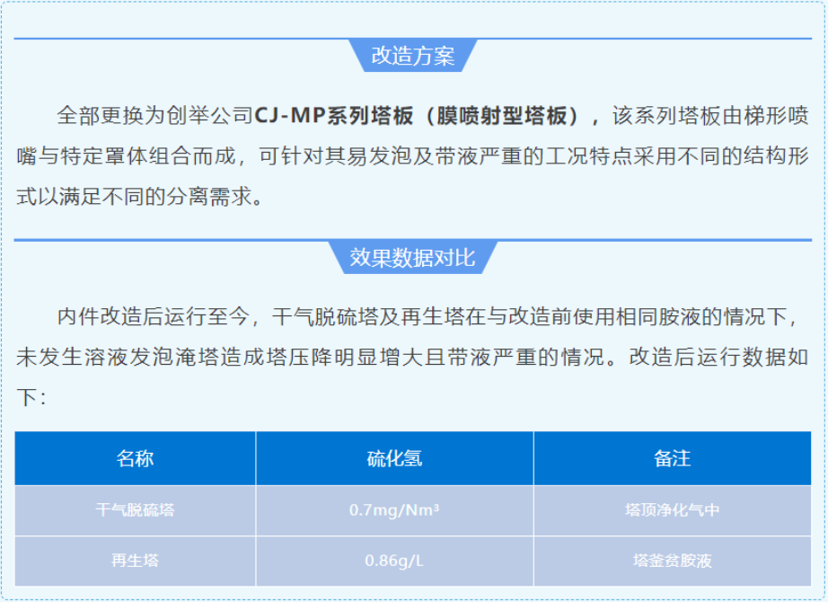 全部工程改造完工后,各項(xiàng)技術(shù)指標(biāo)均滿(mǎn)足生產(chǎn)要求,達(dá)到了改造的目的和預(yù)期,緩解業(yè)主單位的環(huán)保壓力的同時(shí)延長(zhǎng)了設(shè)備檢修周期。創(chuàng)舉公司新型CJ系列高效噴射態(tài)塔盤(pán)技術(shù)在脫硫化氫塔、干氣脫硫塔及再生塔的應(yīng)用效果,得到了榆林煉化領(lǐng)導(dǎo)的高度認(rèn)可。該項(xiàng)目的順利開(kāi)車(chē)是創(chuàng)舉公司在行業(yè)內(nèi)的又一次成功改造案例。