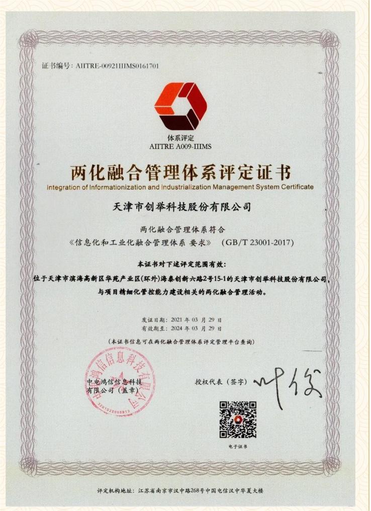 創(chuàng)舉榮譽 | 榮獲國家工信部“兩化融合管理體系評定證書”