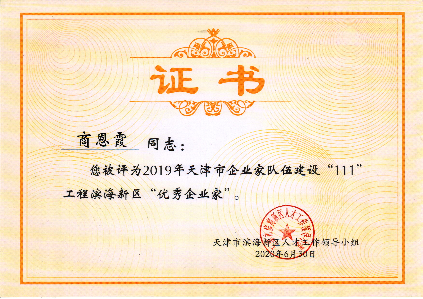 為進(jìn)一步營(yíng)造企業(yè)家創(chuàng)業(yè)發(fā)展良好環(huán)境,加大對(duì)企業(yè)家培養(yǎng)支持力度,天津市濱海新區(qū)開(kāi)展了第二批“優(yōu)秀企業(yè)家”申報(bào)工作,并于近期公布培養(yǎng)名單,商恩霞總經(jīng)理成功入選,這是公司繼王柱祥董事長(zhǎng)榮獲優(yōu)秀企業(yè)家之后獲得的又一項(xiàng)殊榮。