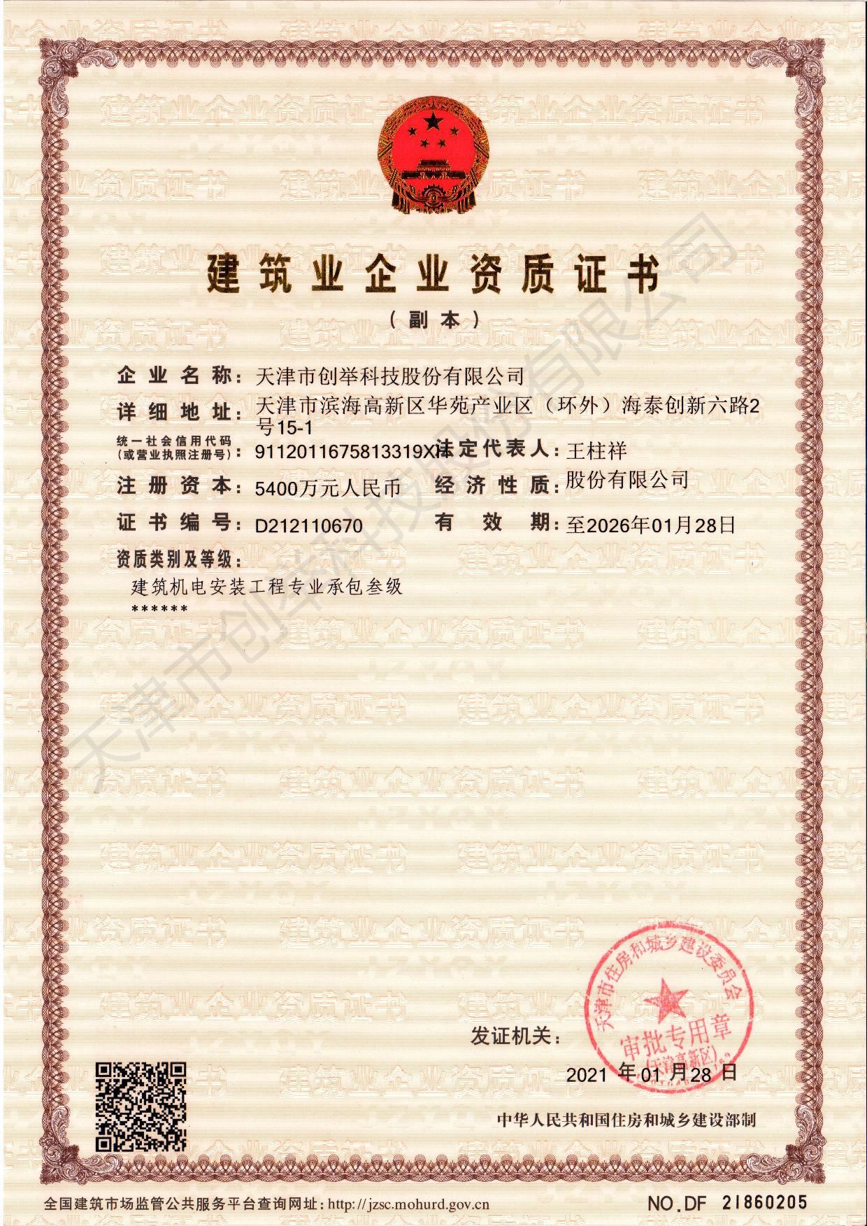 近日,天津市創(chuàng)舉科技股份有限公司(以下簡稱“創(chuàng)舉科技”)申請的“建筑機電安裝工程專業(yè)承包三級資質(zhì)”順利通過天津市住房和城鄉(xiāng)建設(shè)委員會核準,并取得了相應(yīng)的資質(zhì)證書。